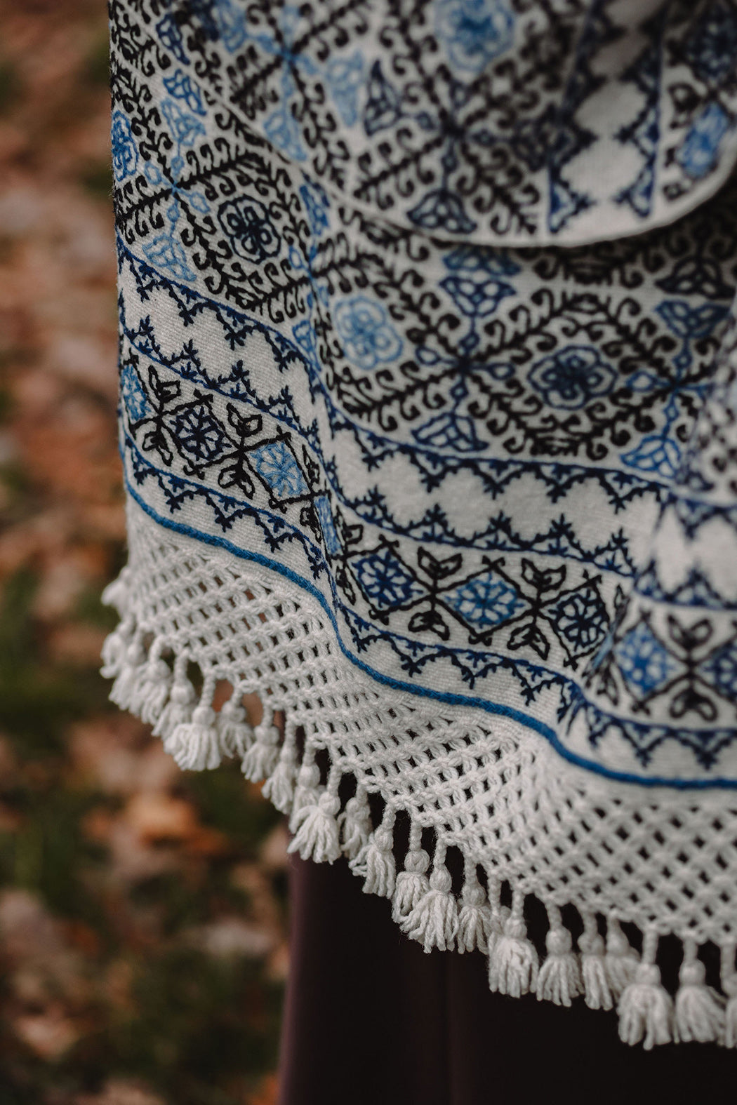 Le tissu est tissé sur métier à ceinture avec la technique du taffetas, offrant une texture dense, chaleureuse et légèrement rustique. Le bleu profond du fond contraste avec la richesse des broderies polychromes qui composent des motifs inspirés de la nature locale : oiseaux, fleurs, fruits, guides végétales et arbres de vie.
