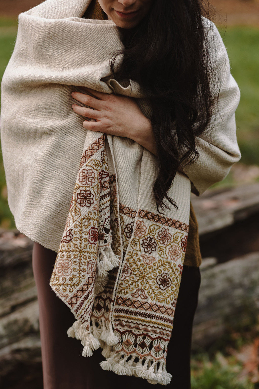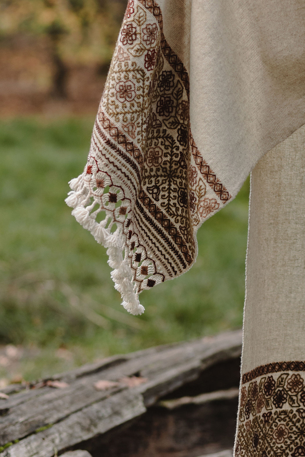 Rebozo d'exception "Guardiana" en laine écrue aux pointes brodées