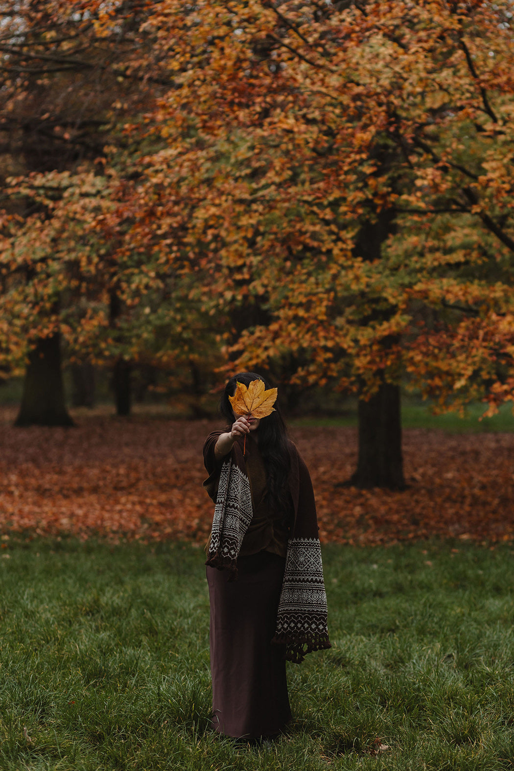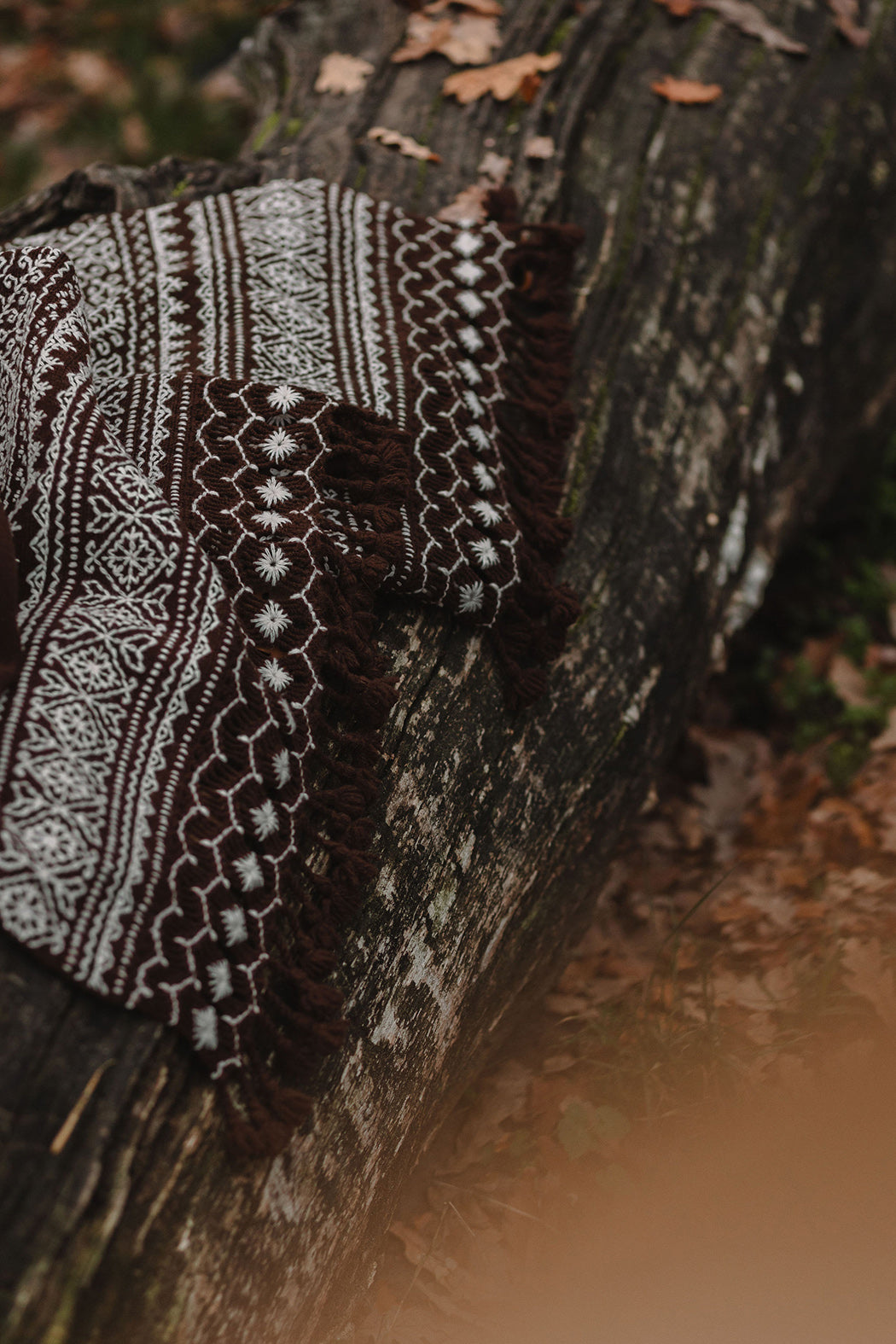 Teints / Coloris : corps en laine teinte aux extraits de noyer, broderie en laine naturelle.